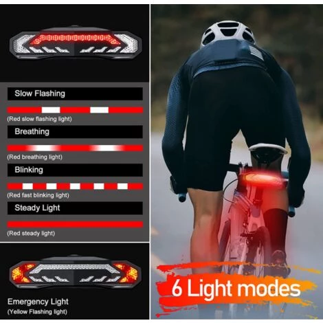 FEU ARRIÈRE DE VÉLO ULTRA-LUMINEUX AVEC 6 MODES – Des feux arrière de vélo super lumineux et extra-larges avec 31 lumières LED haut de gamme, jusqu’à 160 lumens de flashs puissants alertent les automobilistes la nuit et pendant la journée, ce qui améliore votre visibilité et votre sécurité. Clignotement lent Respiration Clignotement rapide Lumière constante Lumière d’urgence OFF, 6 modes d’éclairage facilement sélectionnés par télécommande.