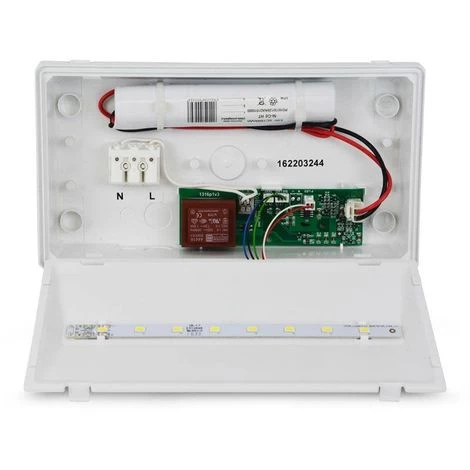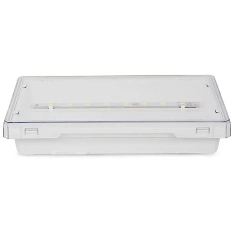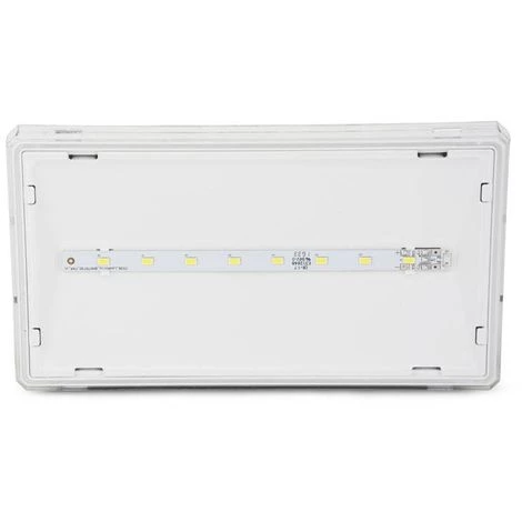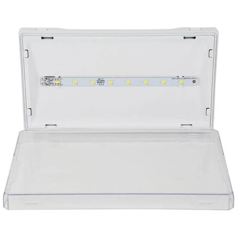 Luminaire de secours extérieur EXIT S 300 lumens. Installation en surface, ou semi-encastrée (avec les ressorts, non inclus ici). Fabriqué en polycarbonate blanc et avec diffuseur transparent. Ce luminaire nous indique à travers sa diode LED s’il est connecté au courant, et la charge accumulée de la batterie. Il possède une AUTONOMIE D’UNE HEURE. La lumière ne s’allume qu’en cas de coupure de courant. Personnalisez-le avec des pictogrammes et la banderole.