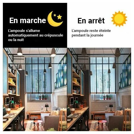 Ampoule 7W à culot E27. Grâce à son capteur de luminosité, elle s’allume automatiquement à la tombée de la nuit lorsque la luminosité décline (seuil de 20 lux). C’est une ampoule LED sans filament, conçue pour supporter de très nombreux cycles d’allumage/extinction. Elle offre un éclairage net et homogène à un angle de 360 degrés. Luminaire certifié IP20 réservé à un usage intérieur ou pouvant s’installer dans une lampe d’extérieur étanche.