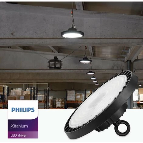 Cloche industrielle LED haute puissance de 200W avec 220-240V/AC et une haute efficacité lumineuse. Grâce à sa conception circulaire extra-plate et légère, elle peut être installée rapidement et facilement. Cette gamelle LED génère une puissante lumière blanche froide (5000K) idéale pour les entrepôts industriels, les grandes surfaces, les ateliers, les espaces sportifs et récréatifs. Fabriquée avec des LED Philips Lumileds d’une efficacité maximale, avec 160lm/w qui vous permettront d’économiser sur votre facture d’électricité. Driver Philips dimmable de 1-10V.