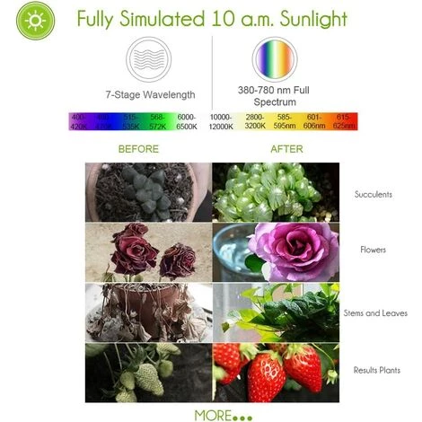 RÉCOLTE CE QUE VOUS VOULEZ – Adoptez 380-780nm de spectre complet en 7 longueurs d’onde, simule la lumière du soleil à 10:00AM. peut être facilement absorbée et favoriser la photosynthèse qui aide les plantes d’intérieur à pousser des plants feuillus, des succulentes / fleurs sucrées, des fruits sucrés et des légumes sucrés.
