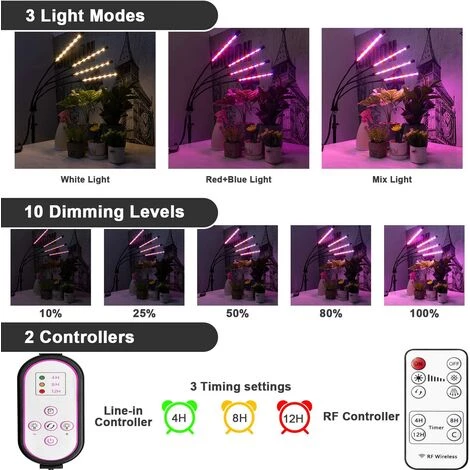 [Contrôleurs doubles] Équipé d’un contrôleur d’entrée de ligne et d’un contrôleur RF (reçu à 30 mètres de distance), prend en charge 3 modes de commutation, 10 luminosité réglable et minuterie de cycle, régler 4 heures / 8 heures / 12 Allumer / éteindre automatiquement tous les jours après l’heure du cycle, facile à utiliser.