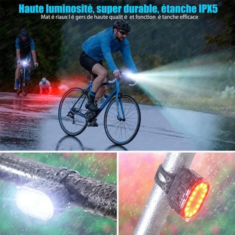 【Léger/Robuste/Étanche】L’ensemble d’éclairage de vélo utilise un boîtier en plastique PC, vous n’avez donc pas à vous soucier qu’il soit trop lourd, il convient aux hommes et aux femmes. L’interface USB est recouverte de silicone étanche à l’eau et à la poussière, associée à la technologie avancée IPX5 étanche à l’eau et à la poussière, adaptée à diverses conditions météorologiques.