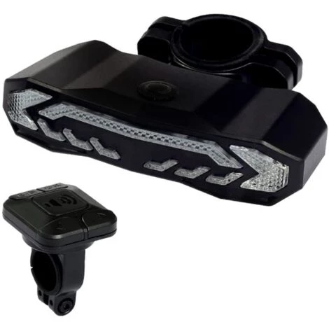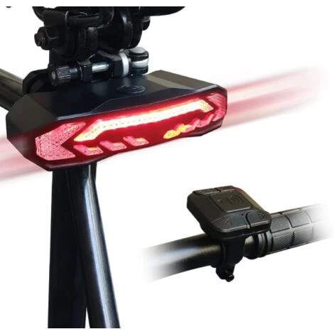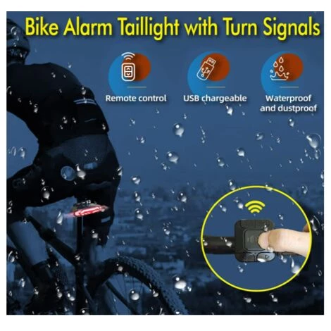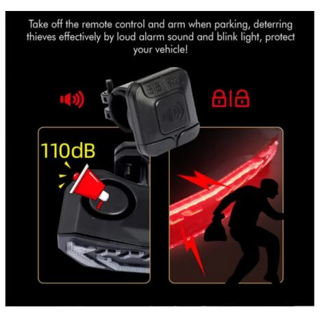 Mode feu arrière de vélo 5 en 1. Voyant d’avertissement/clignotant/cloche électrique/fonction d’alarme antivol.