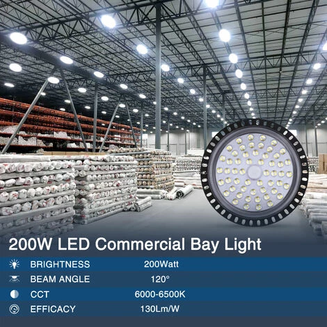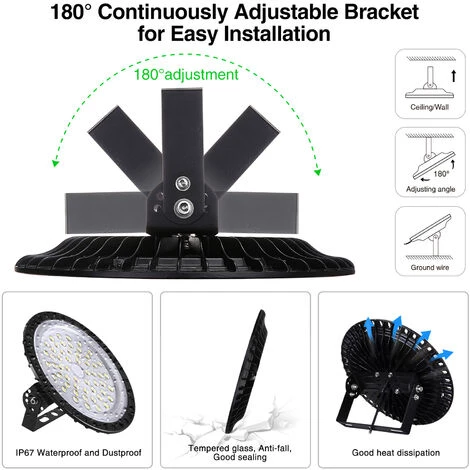 La lampe à LED UFO présente une belle apparence, une coque en aluminium moulé à haute pression et de nombreuses ailettes de dissipation de chaleur sur la coque de la lumière, de sorte que la lumière présente un bon effet de dissipation de chaleur. La lentille PC fait briller la lumière plus efficacement au sol.