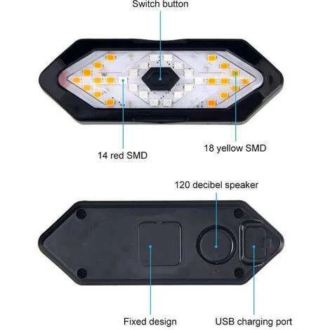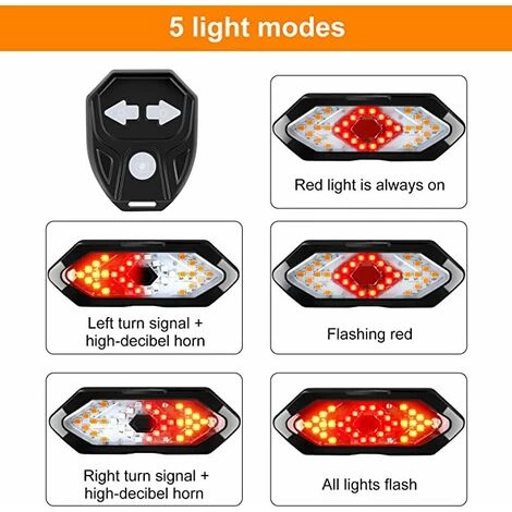 5 OPTIONS DE MODE D’ÉCLAIRAGE – tourner à droite et à gauche avec clignotant sonore à 120 dB, lumière rouge toujours allumée, lumière rouge clignotante ou tout clignotant. Vous pouvez changer les différents modes de signalisation en fonction de vos besoins;
