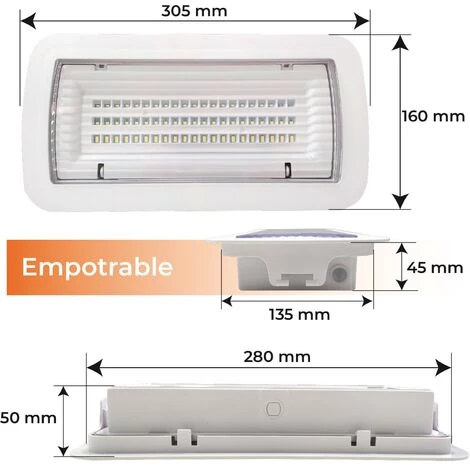 Degré de protection IP65. Il dispose d’un boîtier en ABS Ignifuga, d’une plaque, d’un cadre et d’un diffuseur qui évite de voir l’intérieur de la lampe.