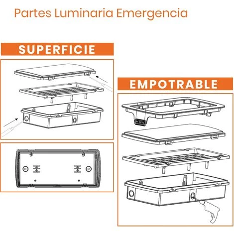 Encastré: En remplaçant l’ancien luminaire par celui-ci, en le plaçant à l’intérieur de l’espace ou en effectuant le trou à un nouvel emplacement. Une fois cette étape effectuée et le câblage raccordé, il est aussi simple que de l’introduire dans l’espace en jetant en arrière les broches de ressorts qui fixent le feu d’urgence.