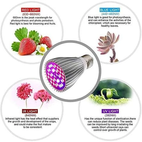 30W E27 Ampoule LED pour Plante, Croissance et Floraison Intérieur La lumière est une condition nécessaire à la croissance des plantes. Sans suffisamment de soleil, les plantes pousseront lentement ou se faneront. La lumière artificielle émise par cette lumière végétale à spectre complet 30W E27 peut favoriser la croissance saine des plantes et aider vos plantes bien-aimées à rester vigoureuses en hiver ou par mauvais temps! Caractéristiques: -Spectre complet -Système de refroidissement en aluminium -Faible consommation d’énergie -E27 culot, facile à installer Quelle distance faut-il garder entre la lumière de la plante et la plante? -La distance dépend dans une certaine mesure de la sensibilité de vos plantes à la lumière. Veuillez vous assurer que les zones nécessaires sont bien éclairées. Cependant, la plante ne doit pas toucher le bulbe. -Il est recommandé que la distance entre la lumière de la plante et la plante soit d’au moins 0,5 m.