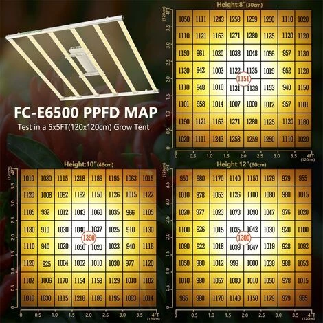 Le FC-E6500 est monté de manière dense avec 3546 puces BridgeLux, ce qui donne un PPFD moyen de 1200 umol/m²/s. Couplé à une lumière rouge et bleue améliorée, le rendement est augmenté de 2.5 g/watt, ce qui rend le FC-E6500 adapté à une grande culture commerciale. - Distribution PAR uniforme: