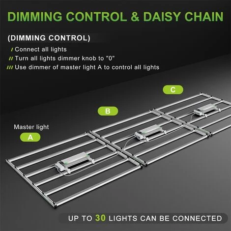 la fonction de gradation permet d’économiser sur les coûts d’électricité et permet une luminosité de 10 % à 100 % pour les différentes étapes de la croissance des plantes. Une seule lumière principale peut connecter jusqu’à 30 lumières dans un système en guirlande. - Système de refroidissement rapide:
