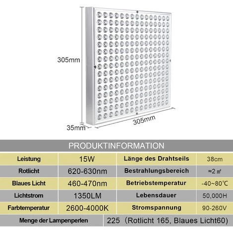 Lampe de plante 15W avec 225 LED de haute qualité: 165 LED rouges (620-630nm) et 60 LED bleues (460-470nm)aide les plantes à croître rapidementoffre le bon spectre lumineux pour les germes et la croissance des plantes. La lumière rouge est bénéfique pour la floraison et la production de graines. La lumière bleue peut augmenter l’efficacité photosynthétiquefavorisant ainsi les tiges et les feuilles.