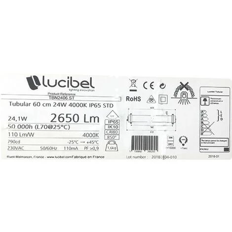 Flux lumineux sortant: 2650lm. Puissance : 24W. Efficacié lumineuse (avec driver): 110Lm/W. Température de couleur: 4000K. Diffuseur: transparent. Driver: Standard. Longueur: 60cm. Durée de vie: 50000h. Indice de protection: ip65. Diamètre: 90mm.