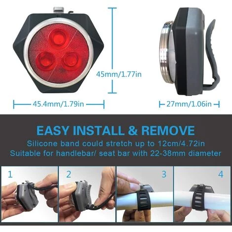 Installation et dmontage facileGrce la sangle lastique en caoutchouc,cette petite lumire vlo puissante peut s’adapter toutes les parties d’un vlo et tous les genres de bicyclettes comme cyclisme, vlos de route, VTC, VTT. Set d’eclairage vlo LED peut tre install en quelques secondes et pas besoin d’outils. .