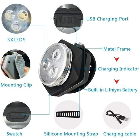 Matriel de Haute QualitUn phare blanc et un feu arrire rouge, cheque avec 3 ampoules LED, sont inclus dans le kit. Lampe de vlo led puissant est fabriqu en alliage d’aluminium de haute qualit, sangle de montage lastique en silicone est avanc et stable. Conception rsistant l’eau,peut s’appliquer en cas de pluie.ces lumires de scurit puissant sont durable et IPX-6 impermable leau. .